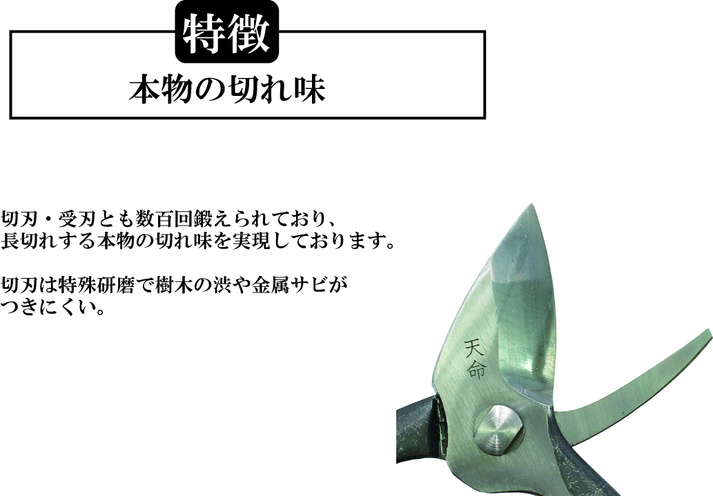天命独自の刃付けと切れ味を残しつつ、受刃と切刃の接点を設けることにより、梨などの誘引紐の切断も可能にした「梨用Kシリーズ」です。