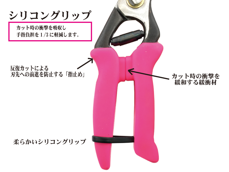 グリップ部に 柔らかいシリコンを採用しているため、カット時の衝撃を吸収し手や腕への負担を軽減します。