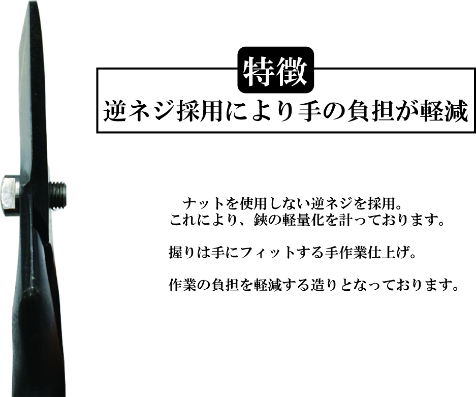 逆ネジ採用によりナットを使わず本体を軽くし、腕を上げての剪定作業の疲れを軽減します。